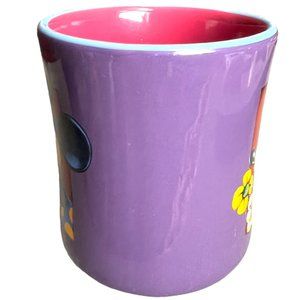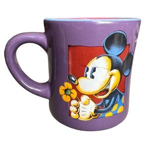 Deep purple exterior--almost eggplant--with complementary deep pink interior. Double-sided, heavy ceramic mug. Minnie moue smiles while holidng a yellow daisy. This mug was made in Thailand and sold in the early 1990s. Collectibe.