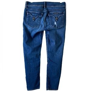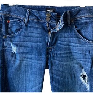 These Hudson Jeans feature a sleek skinny fit in a medium-dark blue wash, highlighted by stylish distressed details. The ankle-length design with a tapered leg offers a modern silhouette, while the faded effect adds depth and character to the denim.