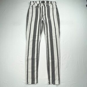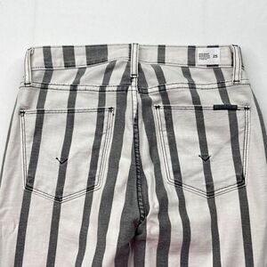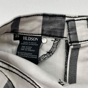 Hudson High Waist Barbara Super Skinny Ankle Jean. Gently preowned in overall good condition. No rips or holes. In a washed out black and white stripe print. Slim silhouette with high rise fit. Faux front pockets