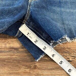 Keywords: Designer denim shorts Jean shorts Flap pockets Casual Cut off Frayed Raw hem High waist Grunge Festival Summer Medium blue wash Faded Distressed Stretch Boho Micro mini High waist denim shorts Jorts
