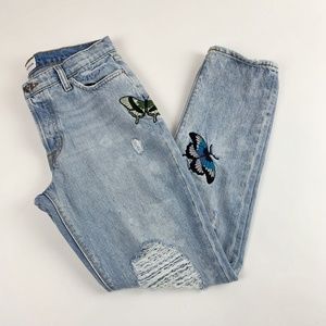 Stylish light blue jeans with butterfly patches. Distressed detailing.