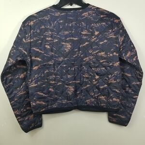 Cool new quilted moto jacket from Hudson Los Angeles is nylon navy blue with a tan abstract print on one side and the other side is a black chambray denim.