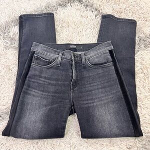 Classic black straight leg jeans with velvet black tuxedo side stripe detail.