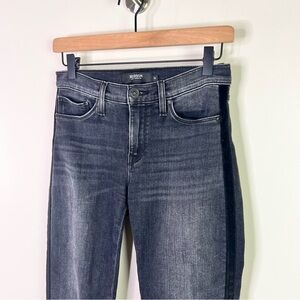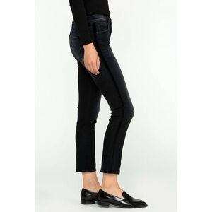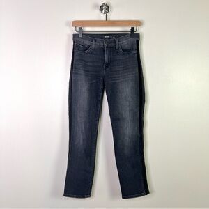 Classic black straight leg jeans with velvet black tuxedo side stripe detail.