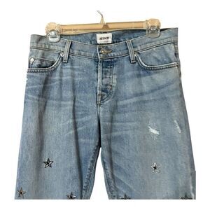 Preowned Riley Crop Relaxed Straight Star Jeans from Hudson Women's size 26 Light blue wash with silver star grommets throughout Relaxed straight leg cropped jeans Boyfriend fit that sits on hits and is slim through the leg Slight intentional distressing throughout Button fly