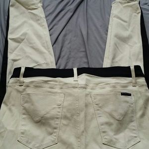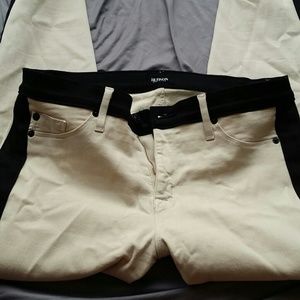 Leeloo super skinny crop jeans. Beige and black. Jean's feature black tuxedo like strip going down both pant legs.