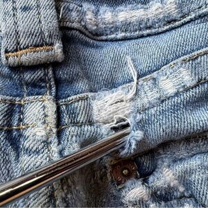 • Condition: Pre-owned. Care tag is washed out/unreadable. Heavily distressed back pocket has a hole in the distressing (see close-up photos). Fraying along waistband and hems. Sold as-is, priced accordingly.