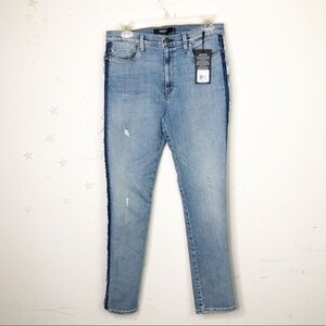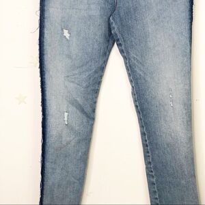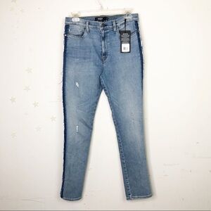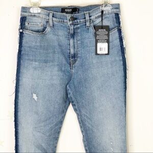 Hudson high rise, Barbara blue stripe skinny jeans, with blue fabric going down each side and raw detailing on each side of the blue stripe new with tags 92% cotton 6% polyester 2% elastin with some distressing.