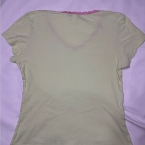 Chic cream tee with pink lace neckline. Short sleeves. Ideal for casual wear.