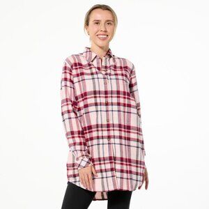 Catch some fashionable ZZZ's and spend cozy, lazy days in this cotton-blend, loose-fitting flannel shirt from HUE. It's an essential for downtime.
