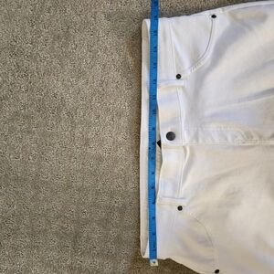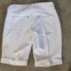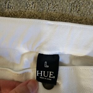These HUE white jean shorts feature a clean, bright denim material with a casual rolled hem, perfect for a summery look. The mid-thigh length and relaxed cut offer comfort and style for any casual outing.