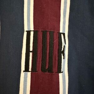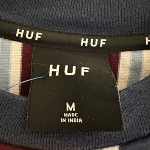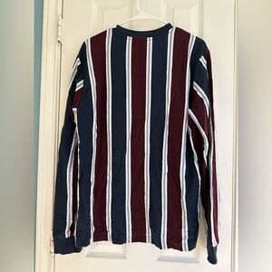 HUF Mens Shirt Sz M Blue Burgundy Striped Front Logo Round Neck Long Sleeve