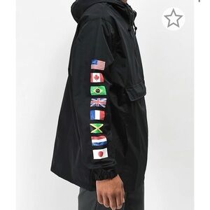 HUF Regional Tour Black Anorak Jacket. Quarter Zip Anorak Closure. Long Sleeves w/ Elastic Cuffs. Adjustable Drawstring Hood. Anorak Style Zip Closure Pocket. Flags Printed Down the Right Sleeve. HUF Logo on Back & Left Sleeve. Cute & Comfy. No Stains or Rips.