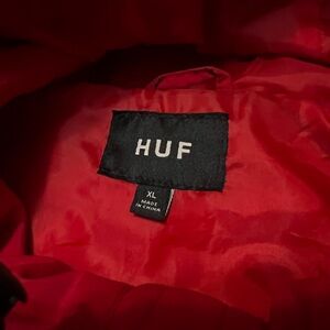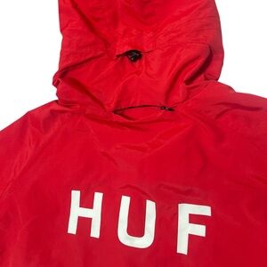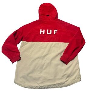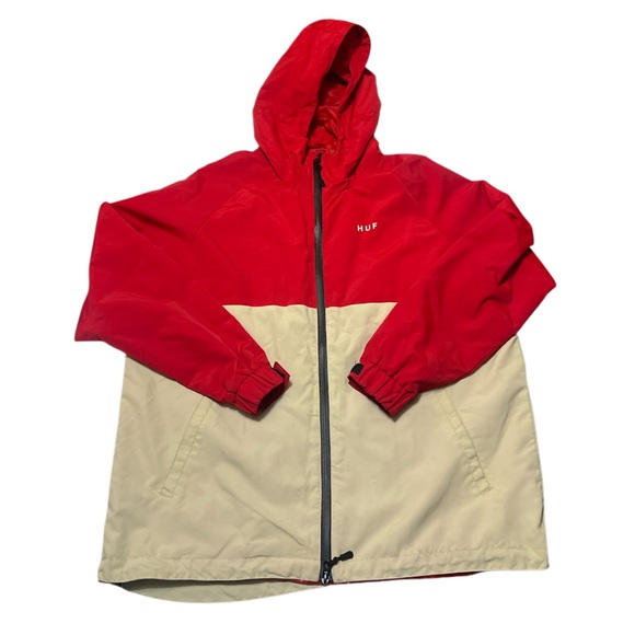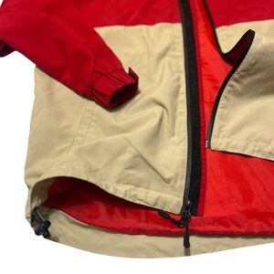 Preloved jacket. 100% nylon, full zip closure with waterproof zipper coating. Mock neck with an adjustable hood.