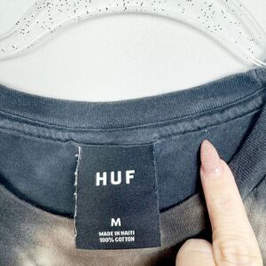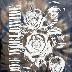Nice navy, tan, and white tee by HUF Worldwide. Tie dye. Short sleeves. Crewneck. White accents and white branding graphic on the front. Large rose graphics on the back. Slight cracking as shown in photos. Tiny pinhole at the neck as shown. Good preowned condition. Men’s size medium.