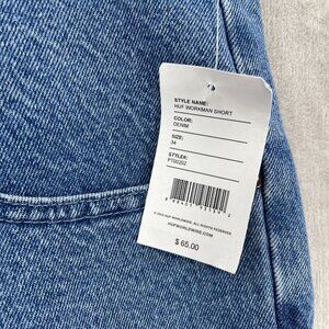 HUF Workman Short in medium wash denim. Embroidered logo at front pocket, hammer loop and carpenter pockets. Material is 100% cotton denim. Size 34. Please see photos for measurements.