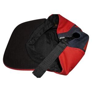 Color: Red brim and lower panels. Upper panels are a mix of dark gray or navy blue with large red graphics (possibly an overlaid "H" or cross design). Features a prominent American Flag patch on the front.