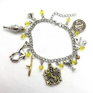 A bracelet for the Hogwarts House Hufflepuff. Features 9 charms and 10 yellow beads. Charms include a platform 9 3/4 charm, always charm with a heart, snitch, cup, emblem of a badger, broomstick, doe, Felix Felicis potion bottle, & sorting hat. Made of silver tone zinc alloy. Lobster clasp closure.