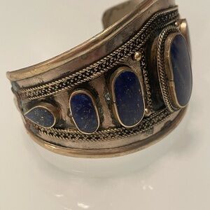HUGE FOOLS GOLD LAPIS LAZULI COIN SILVER WIDE CUFF VINTAGE BRACELET