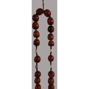This handcrafted wooden rosary necklace features red beads and a crucifix with a yellow string. It measures 3.5ft length.