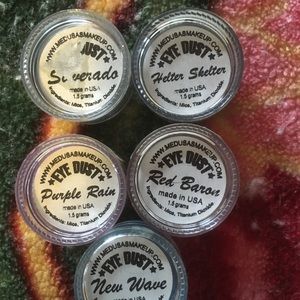 12 piece lot of Medusa's Makeup. 6 glitter, 5 eye dust, and 1 shadow. Vegan and cruelty free. These were purchased at Torrid and came stickered shut, no plastic seal, but none have been used or swatched. I will tape for shipping purposes. Colors of glitter: ZIGGY, GOLD DIGGER, .44 MAGNUM, HEAVY METAL, STARSTRUCK, LIBERACE. Colors of eye dust: SILVERADO, PURPLE RAIN, HELTER SKELTER, RED BARON, NEW WAVE. Shadow is ELECTRO WHITE. M.A.C. Like pigments, glitter, glam and glitz. Cruelty free, vegan.