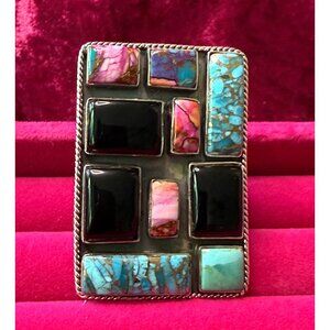 HUGE Sterling Silver Adjustable Ring Onyx Turquoise Spiny Oyster