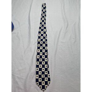 The product is a classic navy blue and ivory geometrically patterned tie made of 100% silk by HUGO BOSS. It is designed in Italy with a 4” wide a classic 57” inch length. The tie features a logo accent, making it a vintage and designer accessory perfect for weddings and preppy occasions. Handmade from high-quality silk, this tie embodies a sense of luxury.