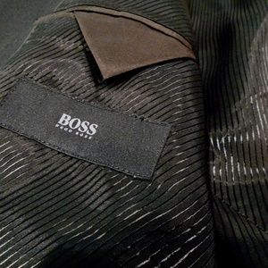 A tailored jacket by HUGO BOSS menswear, created for contemporary appeal. Expertly cut to a streamlined fit, this lined blazer is given an air of refinement with AMF stitching and a buttonhole at the notch of the lapels. REDUCED DRY CLEAN. Size is 44L. Authentic Hugo Boss | Includes two extra buttons stored inside inner coat pocket.