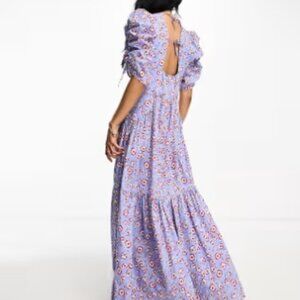 Ditsy flowers add a pop of color to a tiered maxi dress with back ties and framed by puffy sleeves.