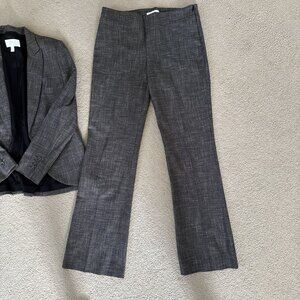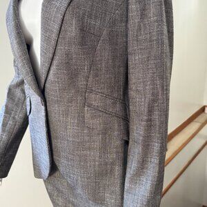 One-button jacket with four-button detailing on wrists and light shoulder padding. Boot cut pants. No functioning pockets.