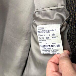 Stylish Hugo Boss tweed sport coat blazer with a textured blue, olive green, black and beige pattern, crafted in Italy. Features a classic fit and double vent for comfort and elegance.