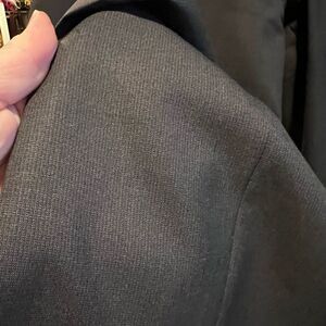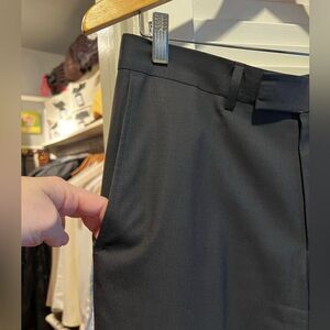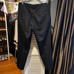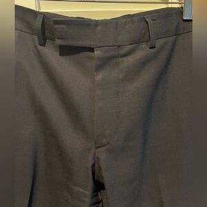 Clean and crisp pair of Hugo Boss men’s trousers in black / dark gray. Faint texture pattern. Two side slit pockets and rear pockets. Perfect with a button down or cashmere sweater and sport coat. Tailored silhouette but very comfortable. Very good preloved condition.