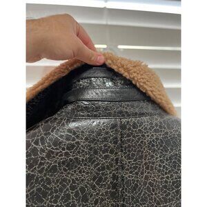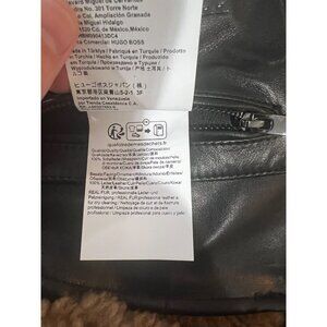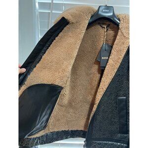 A HUGO BOSS men's black and brown aviator jacket crafted from textured leather with a luxurious shearling collar. This stylish jacket features a full zip front closure and distinct leather trim detailing along the pockets and cuffs. The interior is lined with plush shearling for warmth and comfort. Multiple interior pockets offer practical storage.