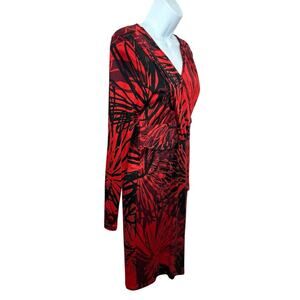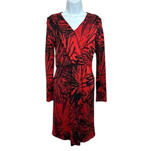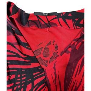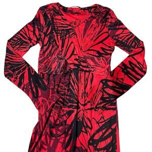 HUGO BOSS Red Black Print Knit Dress Sz Small Long-Sleeve Faux Wrap Knee Length