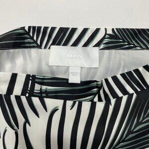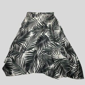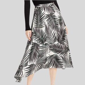 Make a bold, breezy statement with this HUGO BOSS palm-print midi skirt. The asymmetric hem and flowing silhouette bring effortless elegance, while the black and white tropical motif adds a modern twist to timeless style. Perfect for vacation days or city strolls, just add a sleek top and sandals to complete the look.