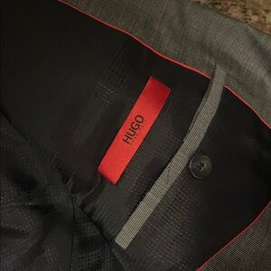 Elegant gray suit by HUGO. Includes jacket and trousers. Perfect for formal occasions.
