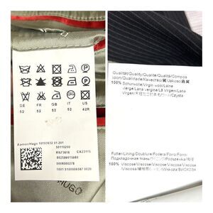 HUGO HUGO BOSS Striped Suit Jacket. • Single breasted, two buttons front style • Single vented back. • 100% Wool, fully lined - 100% viscose. Size 42R, measuring approximately: • shoulders - 18,5 inches • armpit to armpit 22 inches • waist 20,5 inches • center back length 30,5 inches. In very good condition, just one minor damage on the back bottom, please see the last photo. J8