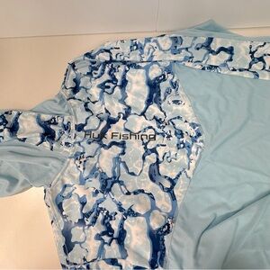 The Huk Men's Icon X Tide Change Lightweight Fishing Hoodie in size Large and blue camo design is a versatile and breathable pullover perfect for any season. Made of polyester and spandex knit fabric, this hoodie features a hooded neckline and long sleeves for added comfort. The blue geometric pattern with the brand logo adds a sporty and outdoorsy touch, making it ideal for fishing or other outdoor activities. Machine washable and designed for performance, this lightweight hoodie is a must-have for any man who loves the great outdoors.