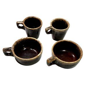 THIS IS A PAIR OF COFFEE MUGS AND A PAIR OF SOUP CHILI MUGS BY HULL BROWN DRIP MID CENTURY MODERN STONEWARE OVENSAFE MADE IN USA