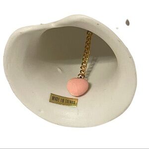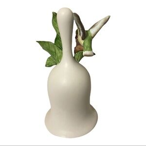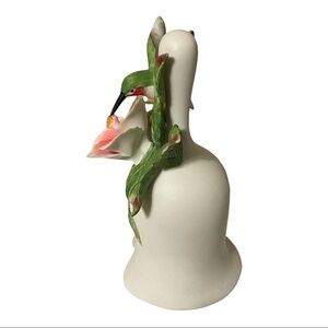 Beautiful plain mat white tulip bell with heart dangle has a hummingbird on a hibiscus bloom. Beautifully painted and detailed. Ceramic, stands 5” tall. No chips or cracks.