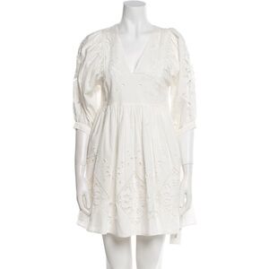 The perfect mini dress for those warmer months. This impeccably tailored frock features a deep v neckline, ¾ length sleeves, and a gathered waistline in an always chic white eyelet cotton.Features a deep v-neckline, length sleeves, pockets, a gathered waistline.