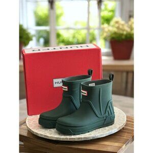 Hunter kids boots, Hunter rain boots, Hunter green boots, waterproof rubber boots, short rain boots, kids size 3 US, UK 2, EU 34, unisex kids rain boots, toddler big kid Hunter, girls boys rain boots, outdoor waterproof shoes, puddle boots, winter, snow, wet weather, grade school, fall boots, spring boots, holiday, mud boots, Nordstrom