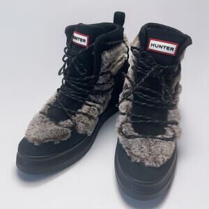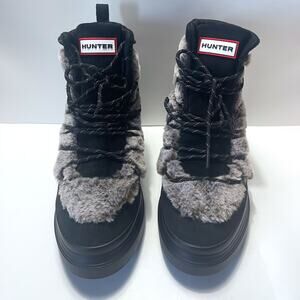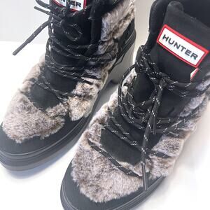 HUNTER NWT Waterproof Faux Fur Trimmed Lace Up Bootie in Black Size 11