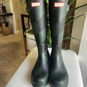 Knee high handcrafted waterproof FSC-certified rubber boots in green and black.Check pattern printed throughout.Ruberized patch logo at collar,cinch strap at outer side,logo printed at outer side,bonded jersey lining,treaded rubber sole,logo-engraved silver-tone hardware part of the Thames MMXX Hunter collaboration.THE BOOTS ARE BRAND NEW WITHOUT THE BOX.