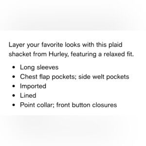 HURLEY JONAH PLAID RELAXED SHACKET NEW WITH TAGS LARGE