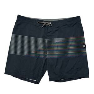HURLEY Rainbow and Black-and-White Stripe on Black Boardshorts. Size 36 Mens. Perfect for swim or trips to the beach/pool. Lightweight. Lace-up closure. Excellent condition with only minor signs of normal wash/wear (minor pulls; see photos) — no rips, stains, or holes. Retail: $45.