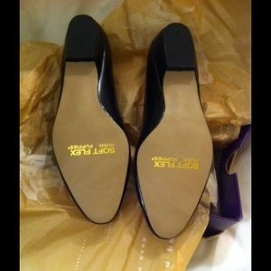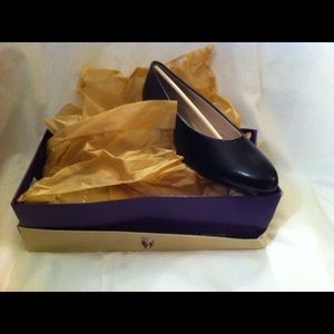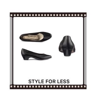 Simple, low-heeled pumps. Synthetic upper; 1 1/4" covered heel; padded sock; rubber sole. Essential to the office wardrobe. Comes with box. Style for less!