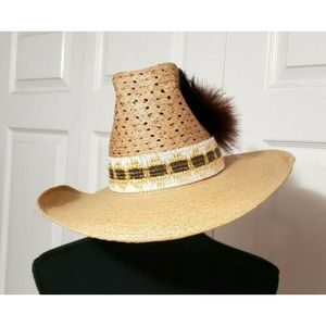 HUSH PUPPIES Western Men's Straw Hat Band Feathers Sz 6 3/4 EUC.