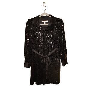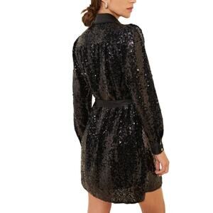 HUTCH $228 Black Sequin Satin Collar Tie Waist Mini Shirtdress Small