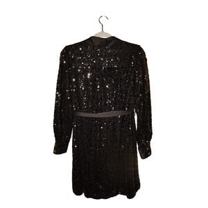 Make a dazzling entrance in this Hutch black sequin mini shirtdress, a stunning blend of sophistication and glamour. Designed with a structured satin collar and matching cuffed long sleeves, this dress offers a chic contrast to the shimmering sequin fabric. The button-down front adds a polished touch, while the adjustable satin tie waist cinches for a flattering silhouette. With its effortless A-line shape and eye-catching sparkle, this versatile piece is perfect for special occasions, holiday parties, or nights out. Pair it with heels for a show-stopping look that radiates elegance and confidence. Lined; button front; removable self-tie belt.